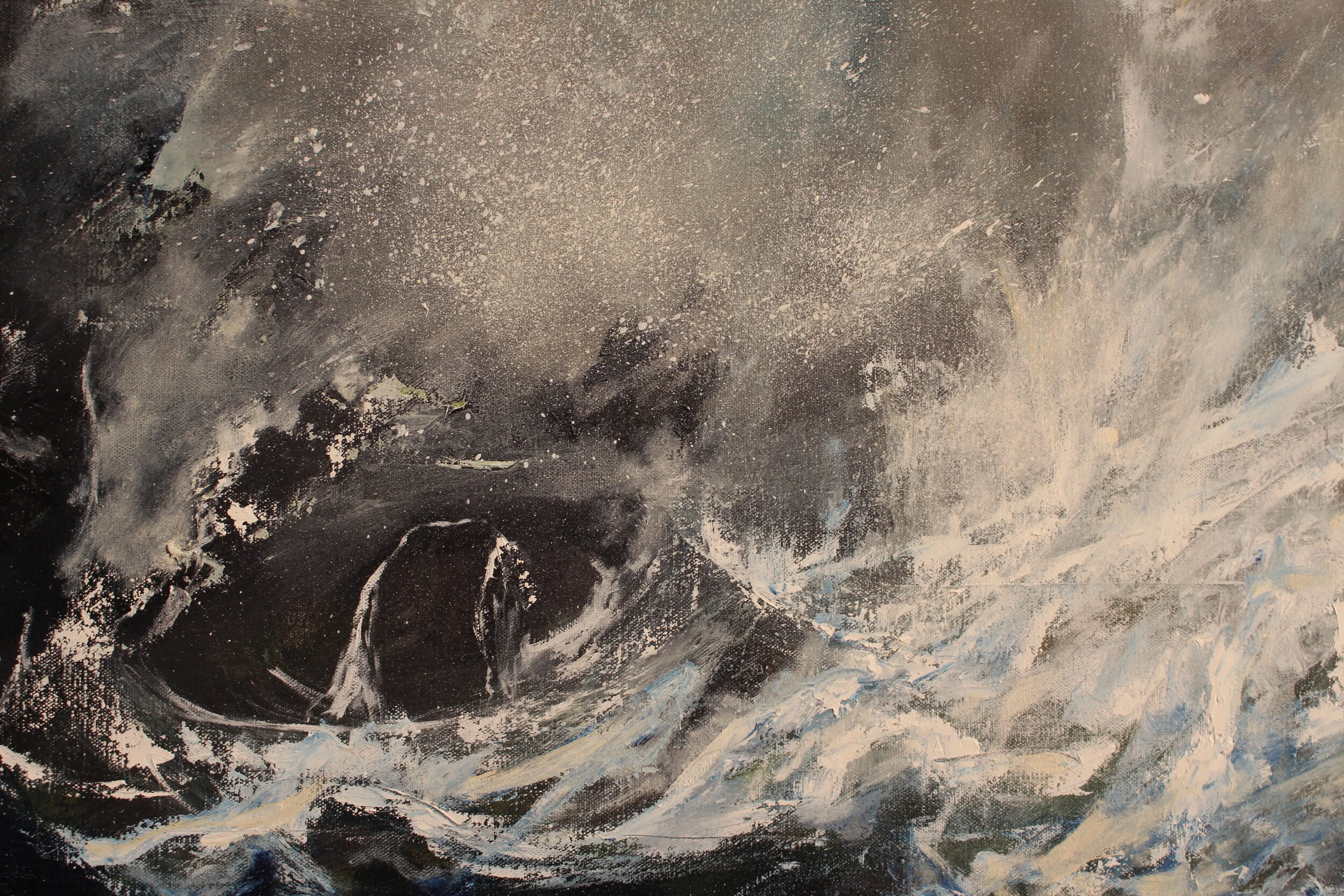 "I like big canvases to express oneself and offer proportion. My mind observes and firmly captures images of the sea. When I’m back at the studio, all hell breaks loose and the painting starts… usually at 4 in the morning!"