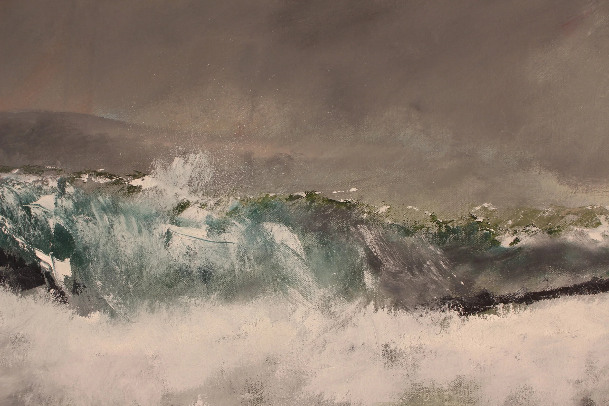 His latest showcase is a seamless blend of crashing waves, hostile winds and vigorous energy portrayed in the shores of the British Isles. His methods include the use of intricate angles, with aggressive brush strokes and scraping palette knives.